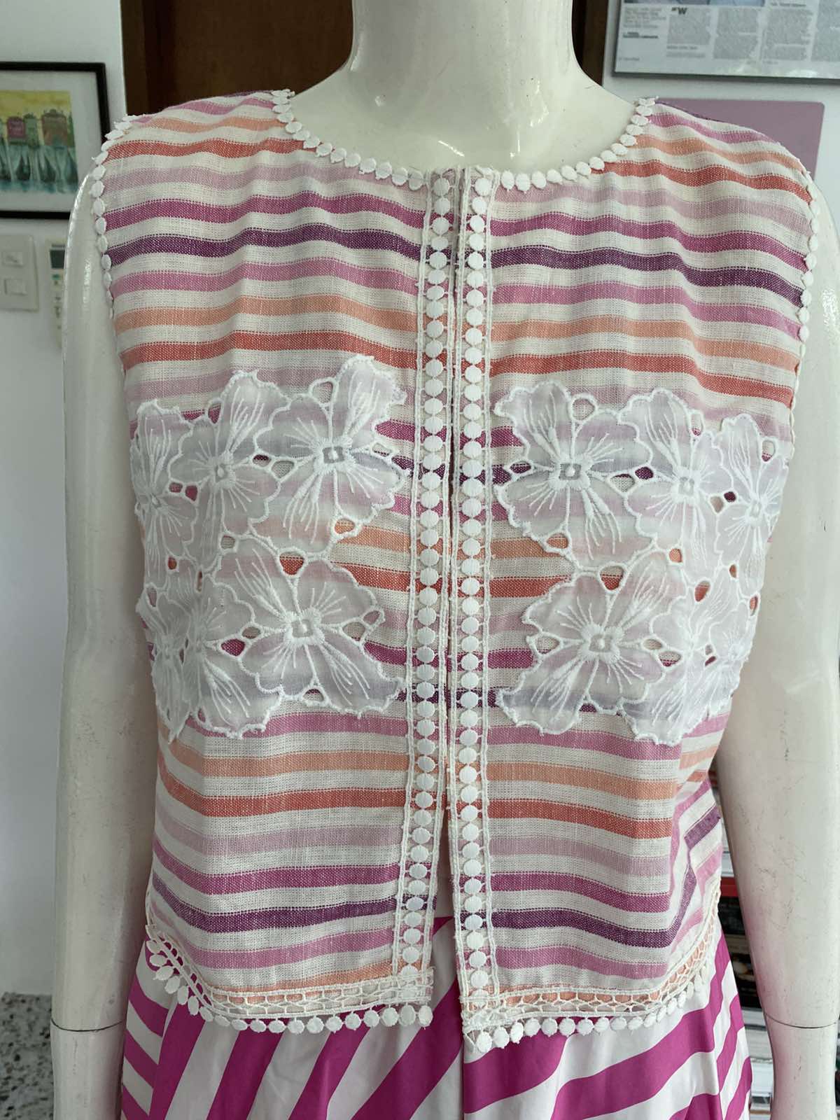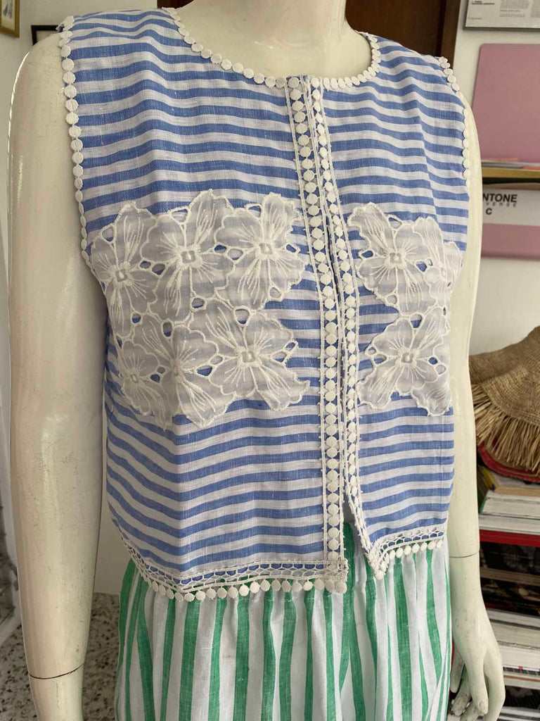Artisanal Embroidery: The front is beautifully embellished with white floral embroidery that creates a sheer, textured effect against the striped base.