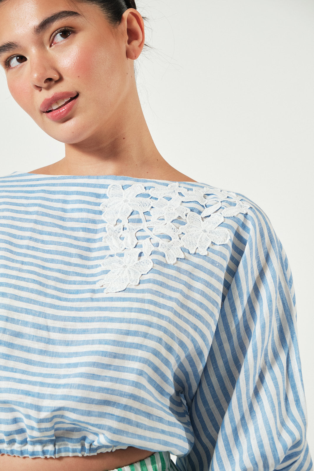 Top: Light blue stripe linen, quarter-sleeved, featuring delicate hand-sewn floral embroidery and a comfortable garterized waist.