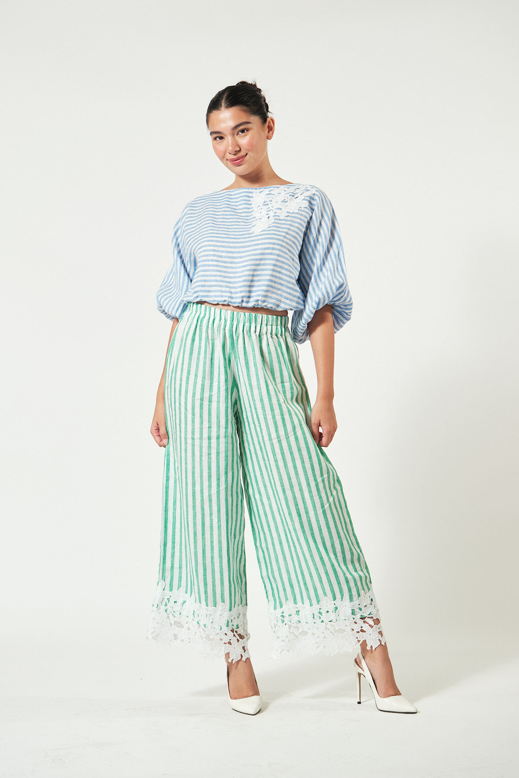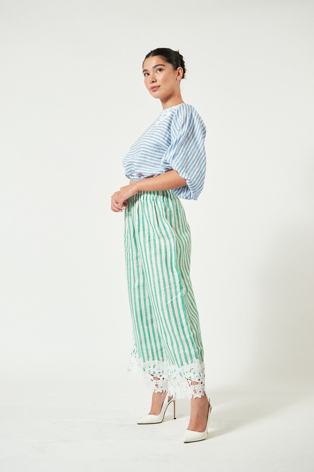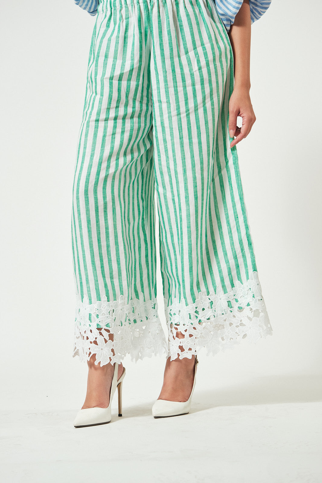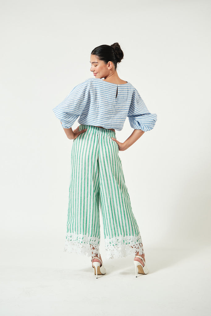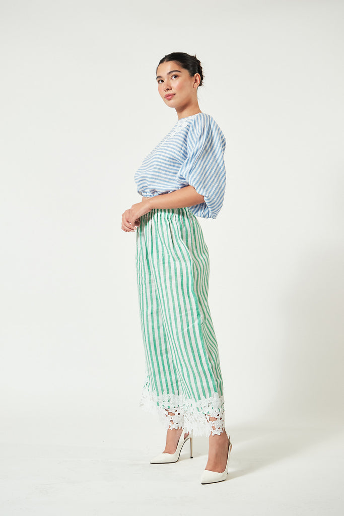 Pants: Coordinating green stripe linen with matching hand-sewn floral embroidery along the bottom hem. The waist is fully garterized for an easy, flexible fit.