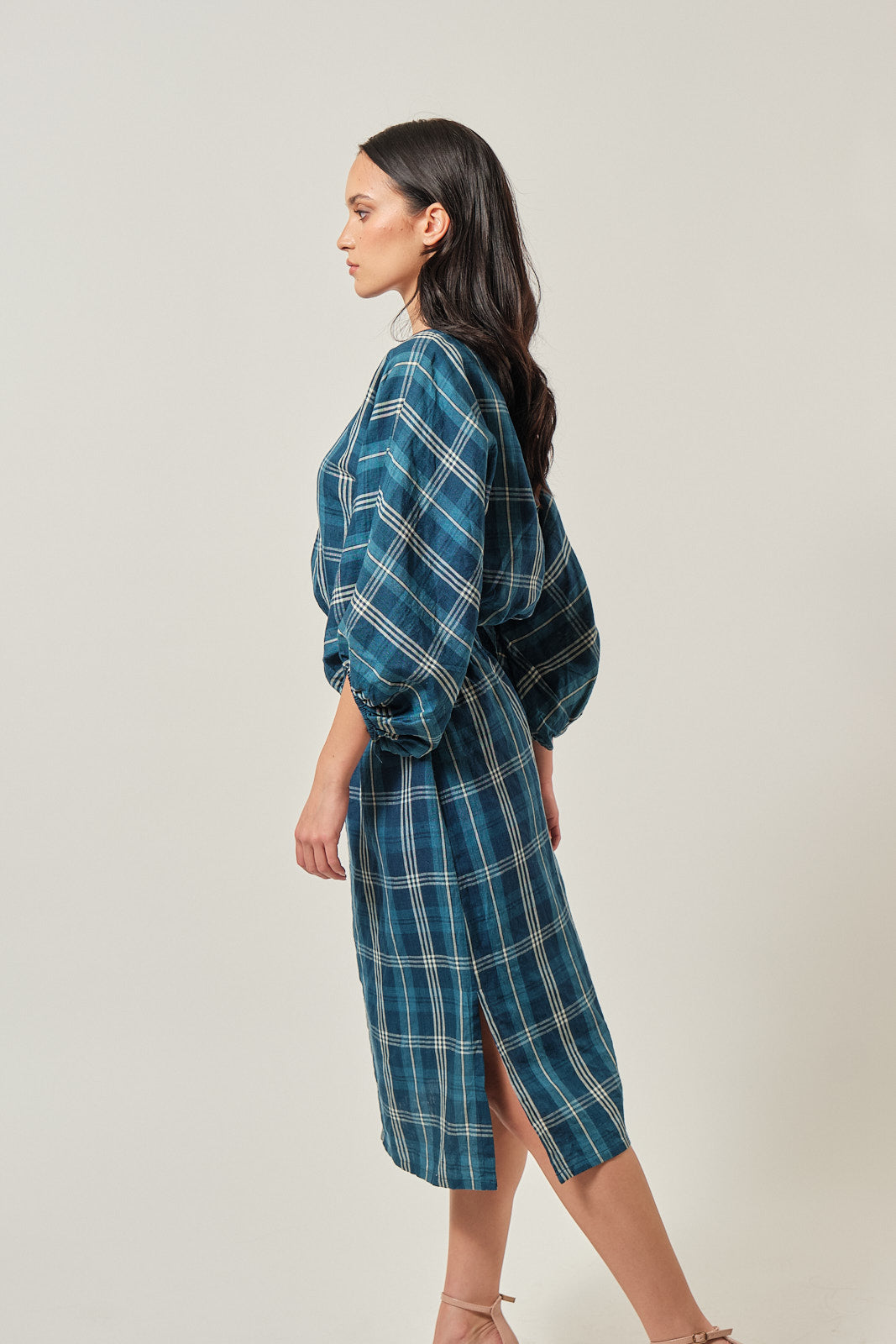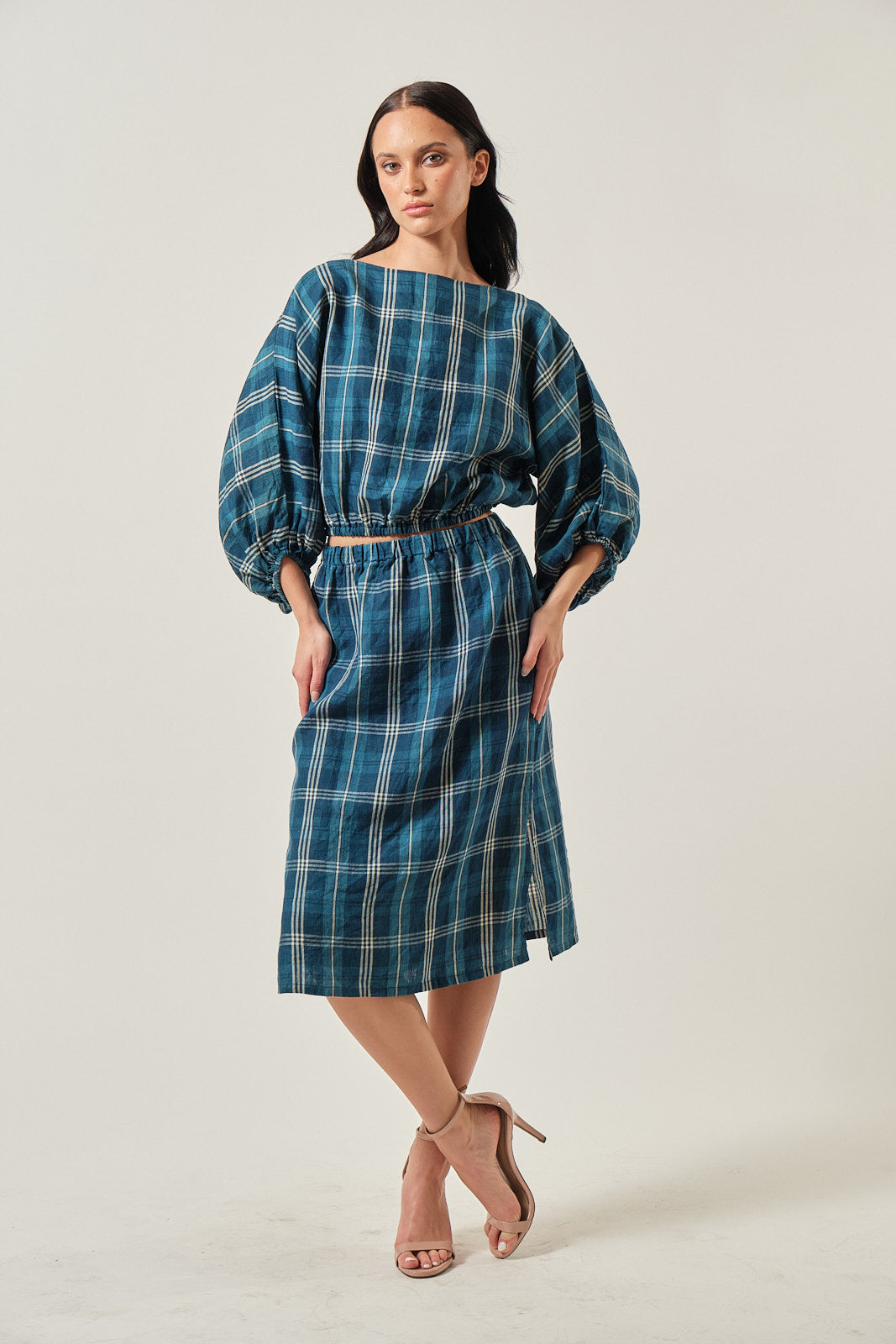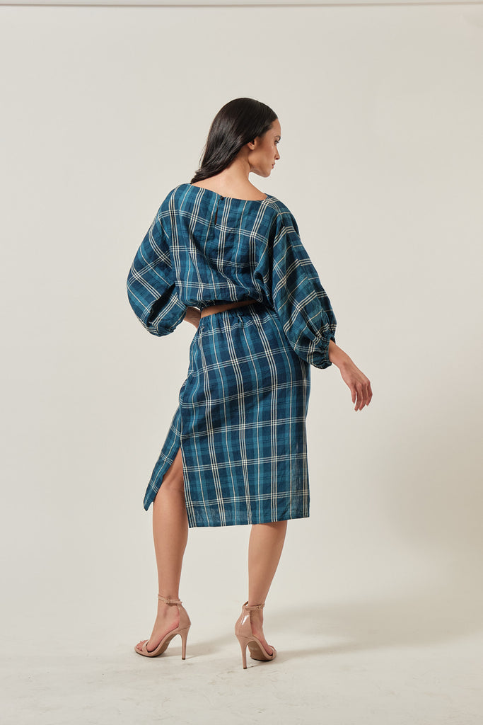 Teresa Linen Top & Skirt Set in Teal Blue Checkered